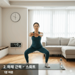 다리를 어깨너비로 벌리고 서주세요. 무릎이 앞으로 나오지 않게 엉덩이를 뒤로 빼며 앉았다 일어납니다. 허리는 반듯하게 유지하고, 시선은 정면을 봅니다. 천천히 15~20회를 반복하여 1분을 채워주세요. 스쿼트는 하체와 엉덩이 근육을 강화하는 데 탁월합니다.