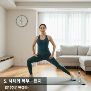 준비물은 심플합니다. 운동이 가능한 평평한 공간 한 평 정도면 충분해요. 필요하다면 미끄럼 방지 매트나 요가 매트를 깔아주면 좋습니다. 움직임이 자유로운 스포츠웨어를 입고, 신발은 벗고 하는 맨발 운동도 괜찮아요. 물 한 잔을 가까이 두는 것도 잊지 마세요.
