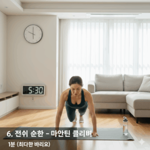 푸쉬업 자세에서 오른쪽 무릎을 가슴 쪽으로 빠르게 당겼다가 다시 보내고, 다리를 번갈아가며 리드미컬하게 움직여줍니다. 1분간 최대한 빠르게 반복하면 유산소, 복부, 상체 순환에 모두 뛰어난 운동이 됩니다. 숨이 가빠져도 무릎이 바닥에 닿지 않게 집중하세요.