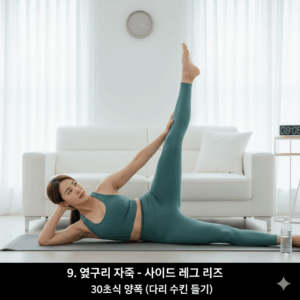 옆으로 누운 상태에서 아랫다리는 구부리고, 윗다리를 천천히 수직으로 들어 올렸다가 내립니다. 한 쪽씩 30초씩, 양쪽 번갈아 실시합니다. 이 동작은 옆구리와 허벅지 라인의 탄력, 몸의 밸런스 유지에도 효과적이에요.